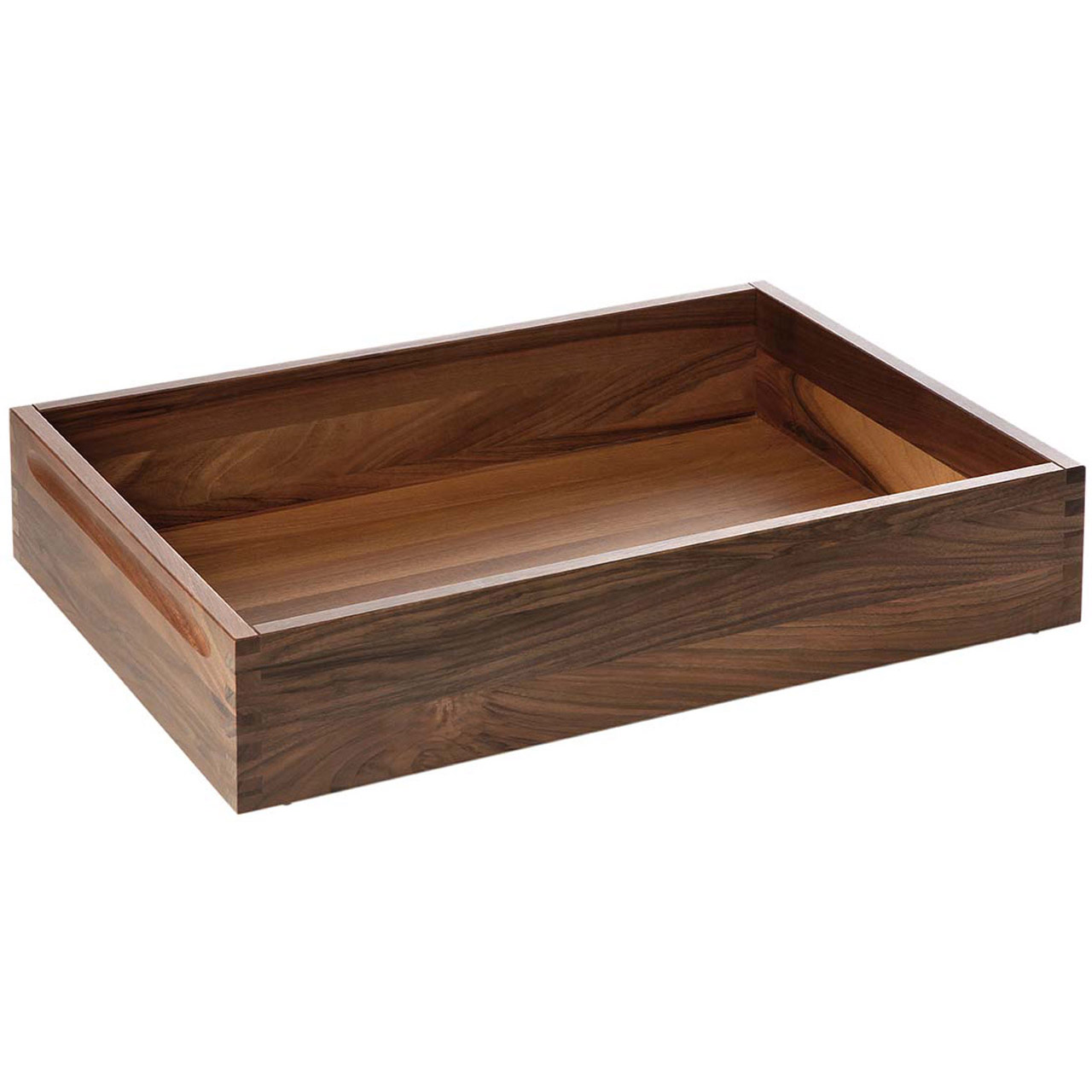 Dřevěný podnos SOLID vyrobený ze dřeva ořešáku, vhodný pro styk s potravinami, se dvěma zapuštěnými úchyty, s gumovými nožičkami. Není vhodný do myčky.