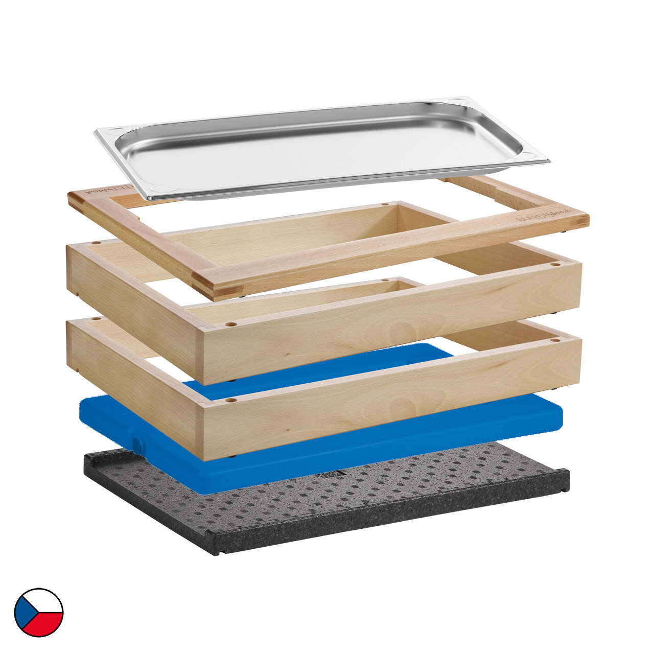Chlazený modul je kompletní řešení pro studený bufet. Tato sestava obsahuje 2 základní rámy (58 x 40,5 x 6,5 cm), doplněné o horní dřevěný rám určený pro GN 1/1, ostatní příslušenství: černá termoizolační podložka, chladicí vložka, nerezová gastronádoba GN 1/1-20 mm. Neutrální dřevěný dekor jemně doladí každé prostředí, ať už jde o hotelovou snídaňovou zónu, firemní bufet nebo cateringové akce. Díky jednoduchému modulárnímu systému lze sestavu snadno přesouvat, kombinovat a přizpůsobovat konkrétním prostorům.