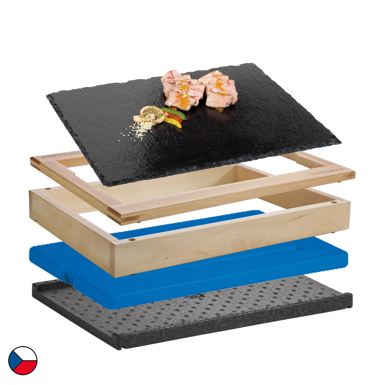 Chlazený modul s břidlicovou deskou je kompletní řešení pro studený bufet. Tato sestava obsahuje 1 základní rám (58 x 40,5 x 6,5 cm), doplněný o horní dřevěný rám určený pro GN 1/1, ostatní příslušenství: černá termoizolační podložka, chladicí vložka, břidlicový podnos GN 1/1. Neutrální dřevěný dekor jemně doladí každé prostředí, ať už jde o hotelovou snídaňovou zónu, firemní bufet nebo cateringové akce. Díky jednoduchému modulárnímu systému lze sestavu snadno přesouvat, kombinovat a přizpůsobovat konkrétním prostorům.