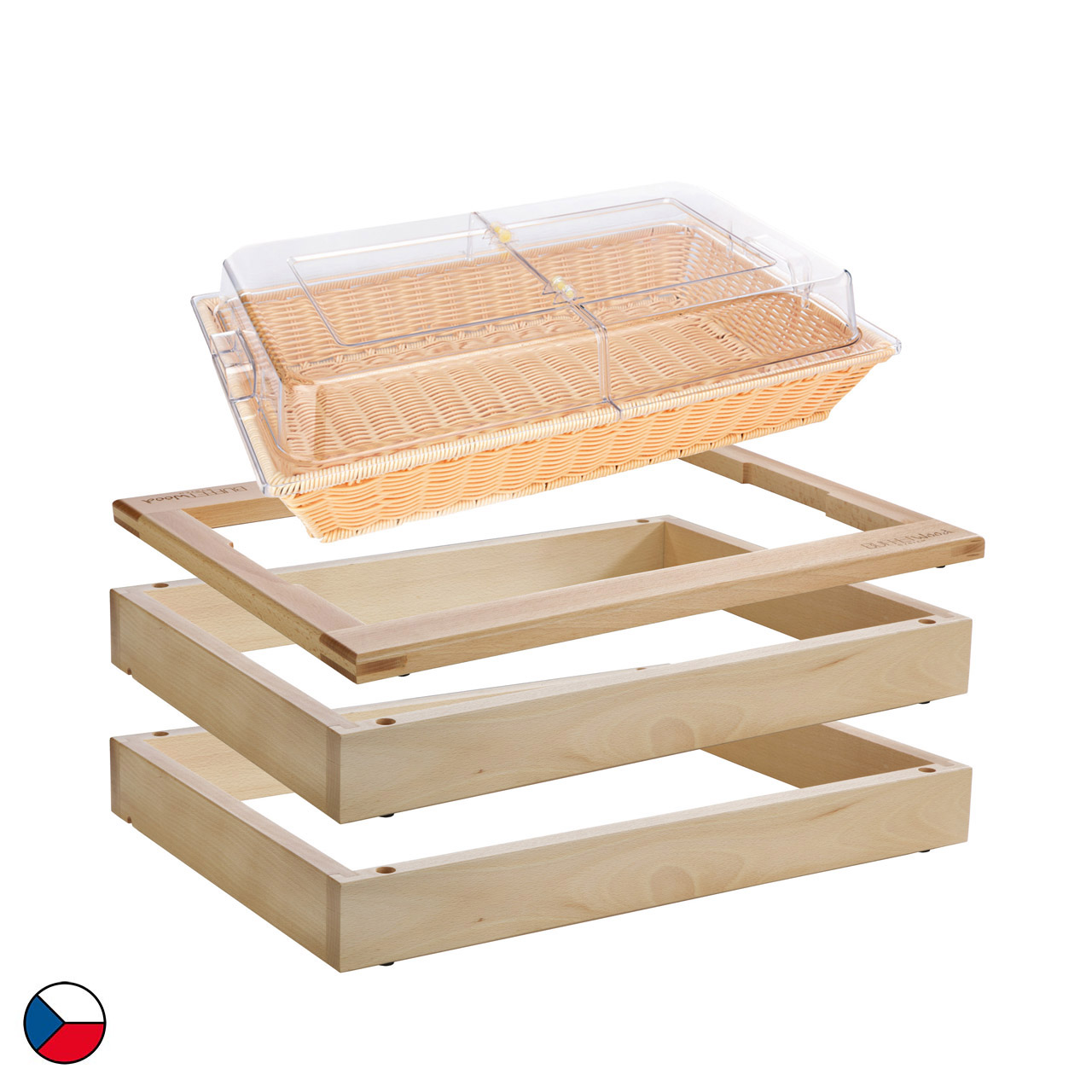 Neutrální modul s košem na pečivo je kompletní řešení pro snídaňový bufet. Tato sestava obsahuje 2 základní rámy (58 x 40,5 x 6,5 cm), doplněné o horní dřevěný rám určený pro GN 1/1, ostatní příslušenství: koš na pečivo GN 1/1 s poklopem. Neutrální dřevěný dekor jemně doladí každé prostředí, ať už jde o hotelovou snídaňovou zónu, firemní bufet nebo cateringové akce. Díky jednoduchému modulárnímu systému lze sestavu snadno přesouvat, kombinovat a přizpůsobovat konkrétním prostorům.