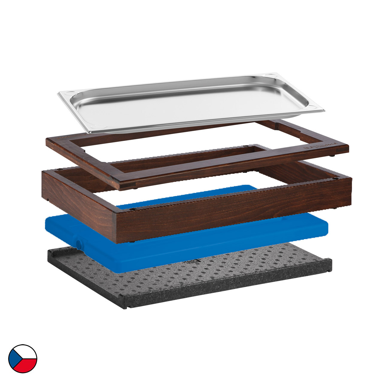 Chlazený modul v tmavém provedení je kompletní řešení pro studený bufet. Tato sestava obsahuje 1 základní rám (58 x 40,5 x 6,5 cm), doplněný o horní dřevěný rám určený pro GN 1/1, ostatní příslušenství: černá termoizolační podložka, chladicí vložka, nerezová gastronádoba GN 1/1-20 mm. Dřevěný dekor v tmavém provedení jemně doladí každé prostředí, ať už jde o hotelovou snídaňovou zónu, firemní bufet nebo cateringové akce. Díky jednoduchému modulárnímu systému lze sestavu snadno přesouvat, kombinovat a přizpůsobovat konkrétním prostorům.