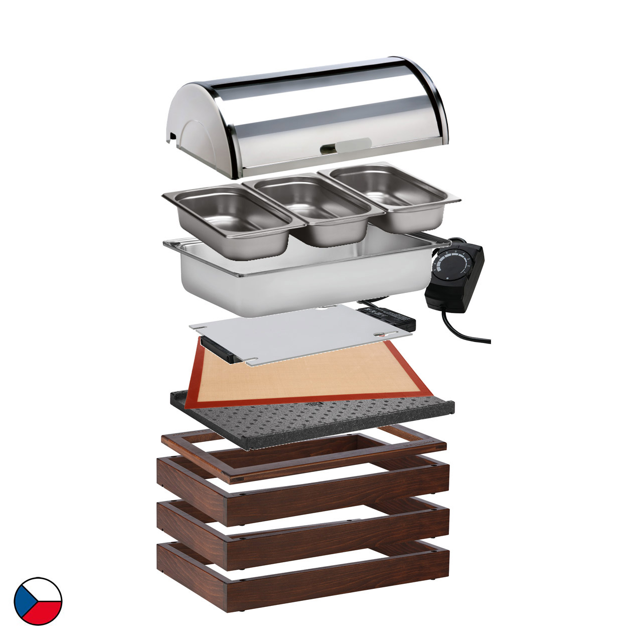 Vyhřívaný modul v tmavém dekoru je kompletní řešení pro teplý bufet. Tato sestava obsahuje 3 základní rámy (58 x 40,5 x 6,5 cm), doplněné o horní dřevěný rám určený pro vodní lázeň, ostatní příslušenství: černá termoizolační podložka, silikonová vložka, elektrické topení 400 W, 3 x nerezová gastronádoba GN 1/3-65 mm, nerezový roll-top poklop. Dřevěný dekor v tmavém provedení jemně doladí každé prostředí, ať už jde o hotelovou snídaňovou zónu, firemní bufet nebo cateringové akce. Díky jednoduchému modulárnímu systému lze sestavu snadno přesouvat, kombinovat a přizpůsobovat konkrétním prostorům.