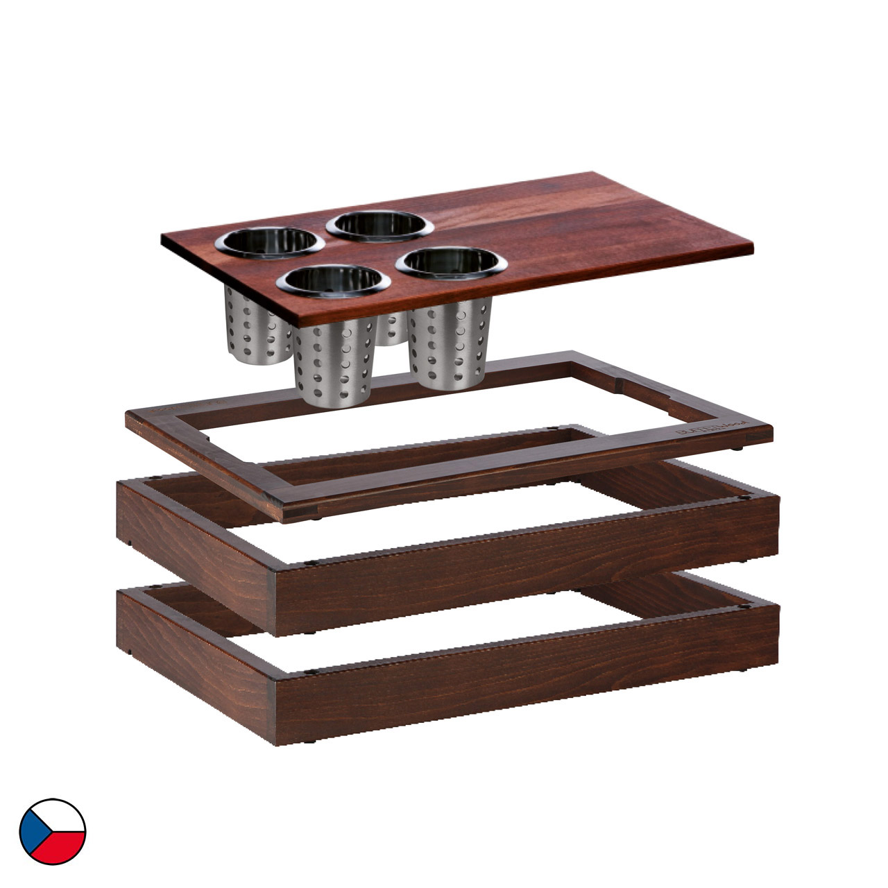 Neutrální modul v tmavém provedení s nástavcem se čtyřmi otvory na příborové košíky je kompletní řešení pro snídaňový bufet. Tato sestava obsahuje 2 základní rám (58 x 40,5 x 6,5 cm), doplněné o horní dřevěný rám určený pro GN 1/1, ostatní příslušenství: horní nástavec se čtyřmi otvory, 4 x nerezový příborový košík. Dřevěný dekor v tmavém provedení jemně doladí každé prostředí, ať už jde o hotelovou snídaňovou zónu, firemní bufet nebo cateringové akce. Díky jednoduchému modulárnímu systému lze sestavu snadno přesouvat, kombinovat a přizpůsobovat konkrétním prostorům.