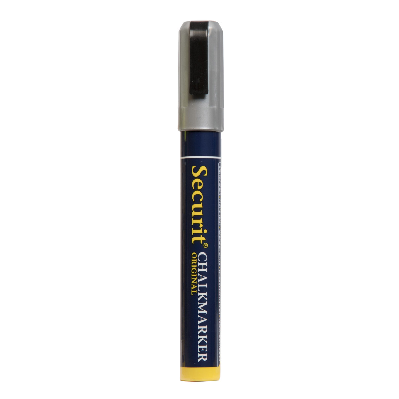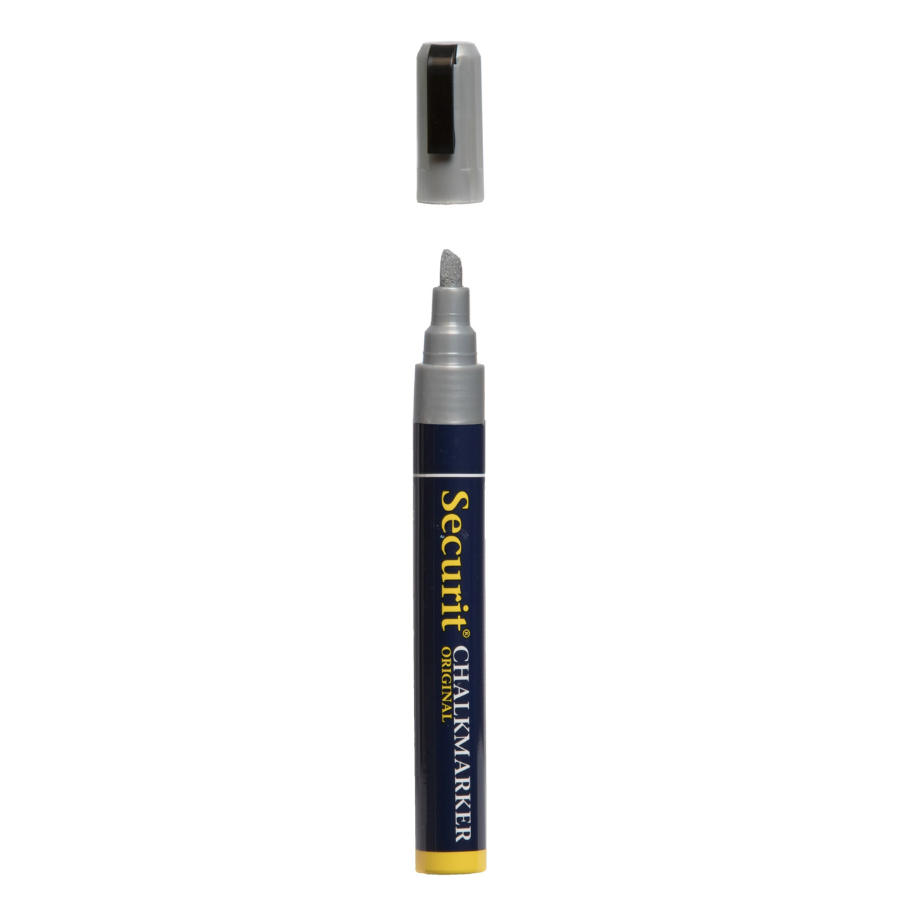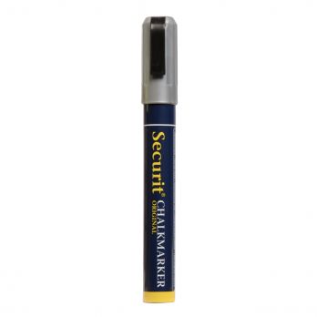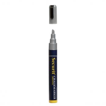 Křídový střední popisovač, šířka hrotu: 2 - 6 mm, stříbrný. Po uschnutí je odolný proti rozmazán, vyblednutí nebo smytí slabým deštěm. Čistí se houbičkou.