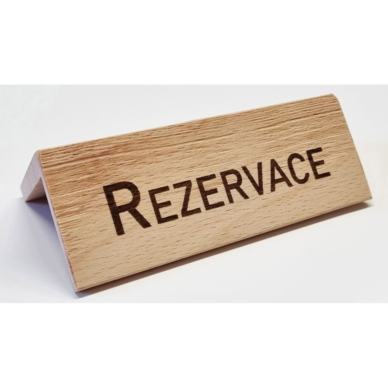 Jednoduchá dřevěná oboustranná rezervační tabulka z přírodního bukového dřeva. Z každé strany má laserem vypálený nápis REZERVACE. Rozměry 10 x 5 cm, výška 3 cm.