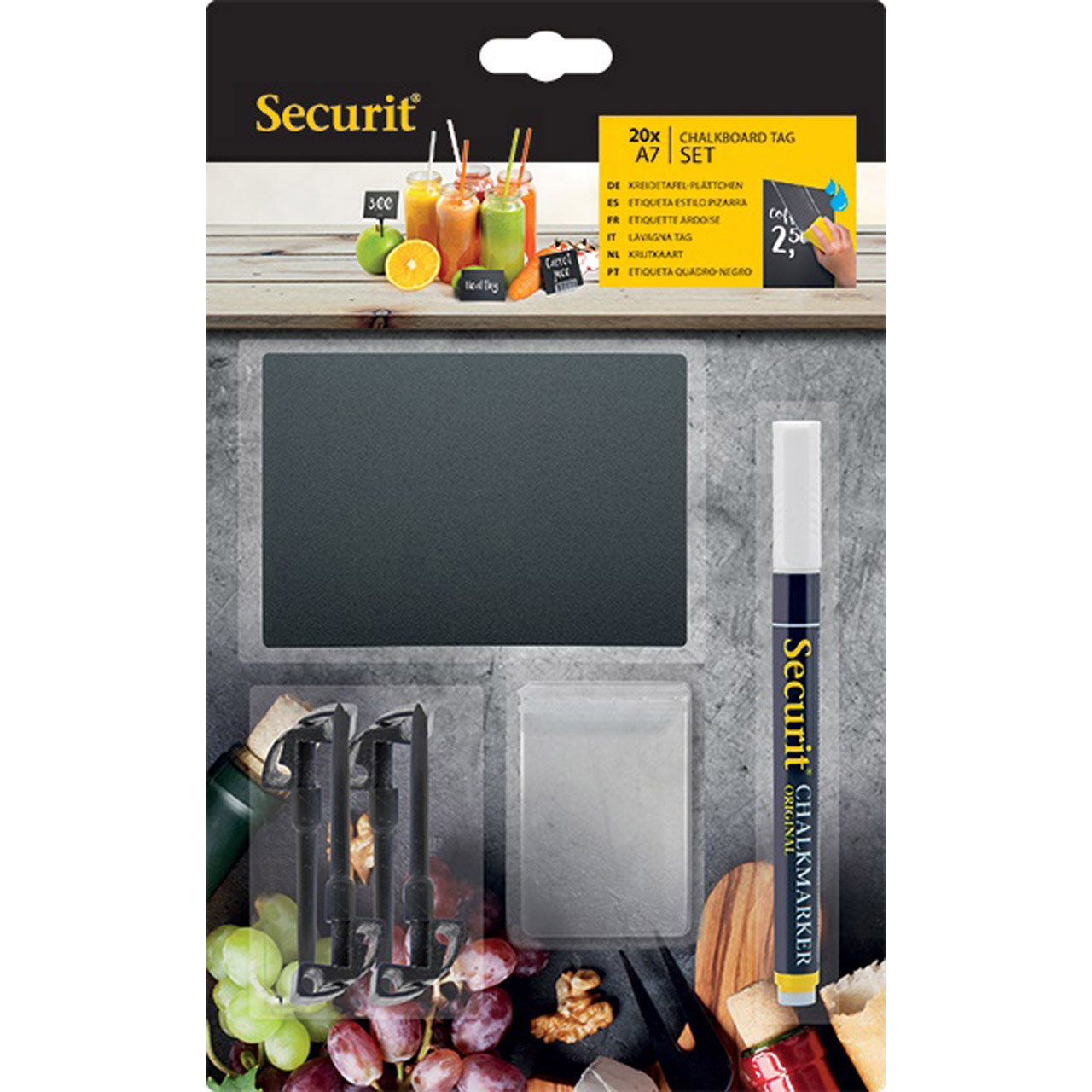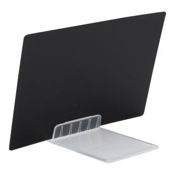 Doplňkové popisovací černé plastové tabulky velikosti A7. Tabulky se prodávají v sadě po 20 ks. Součástí této sady je jeden bílý popisovač , 4 zapichovací a 2 transparentní stojánky.