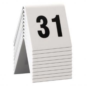 Rozlišovací tabulky na stůl. Jsou vyrobeny z plastu bílé barvy s černými číslicemi 31 až 40.