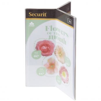 Jednoduchý trojstranný stolní stojánek na letáčky z průhledného plastu. Formát A5.