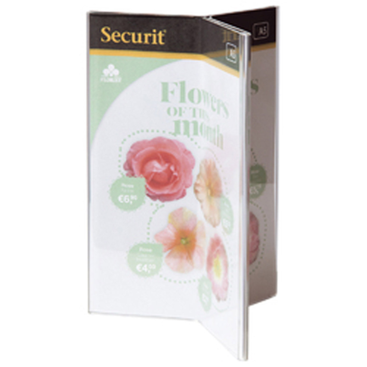 Jednoduchý trojstranný stolní stojánek na letáčky z průhledného plastu. Formát A6.
