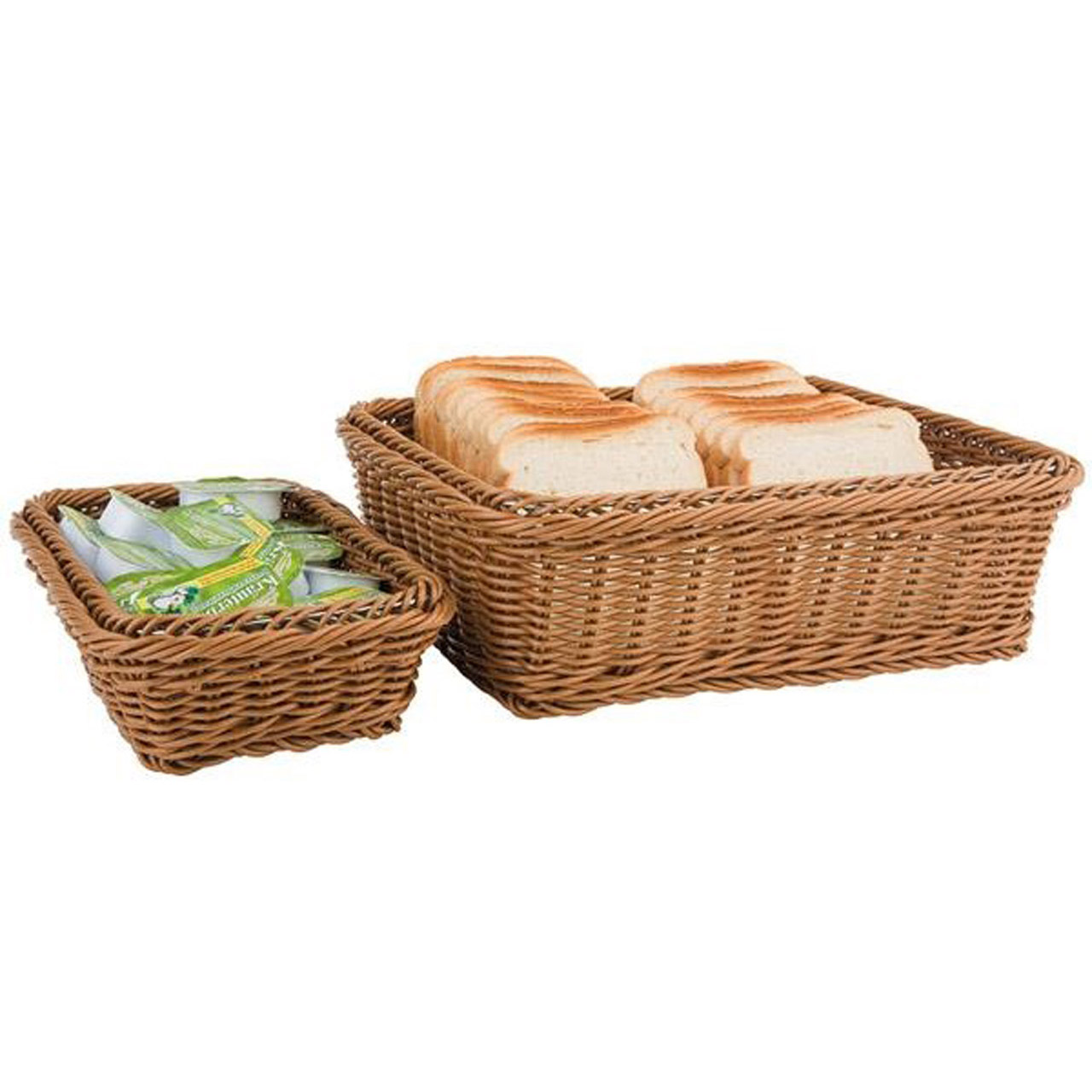 Košík z polyratanu. Velikost GN 1/3 (32,5 x 17,6 cm), výška 6,5 cm. Košíky lze stohovat a jsou omyvatelné - lze mýt v myčce. Promýšlený a funkční design je praktický nemožné poškrábat během skladování. Lze použít do bufetového stojanu pod číslem 100021096.