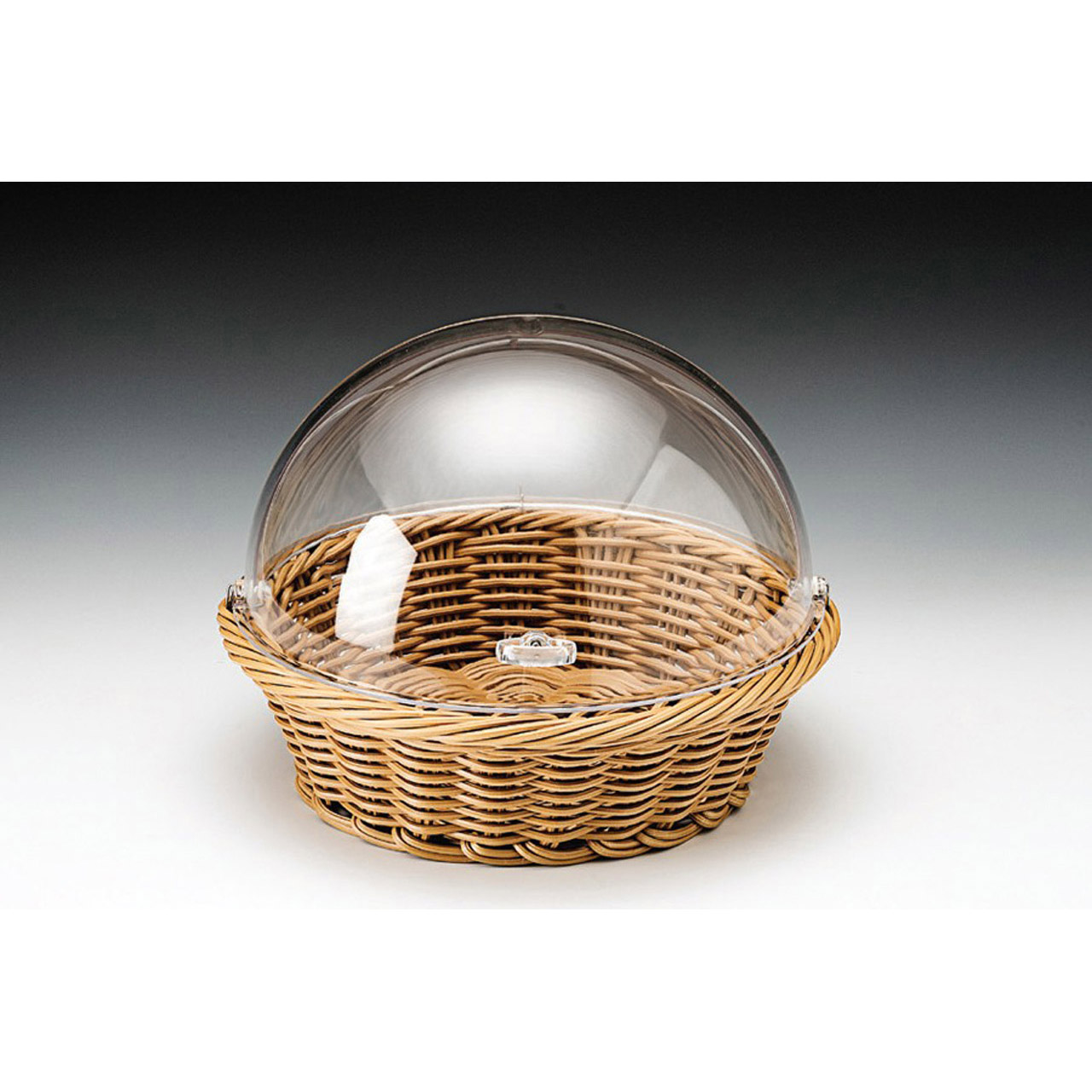 Kulatý košík z polyratanu s akrylátovým poklopem - roll-topem s úchytem. Košík je omyvatelný. Průměr 35 cm, výška 26 cm.