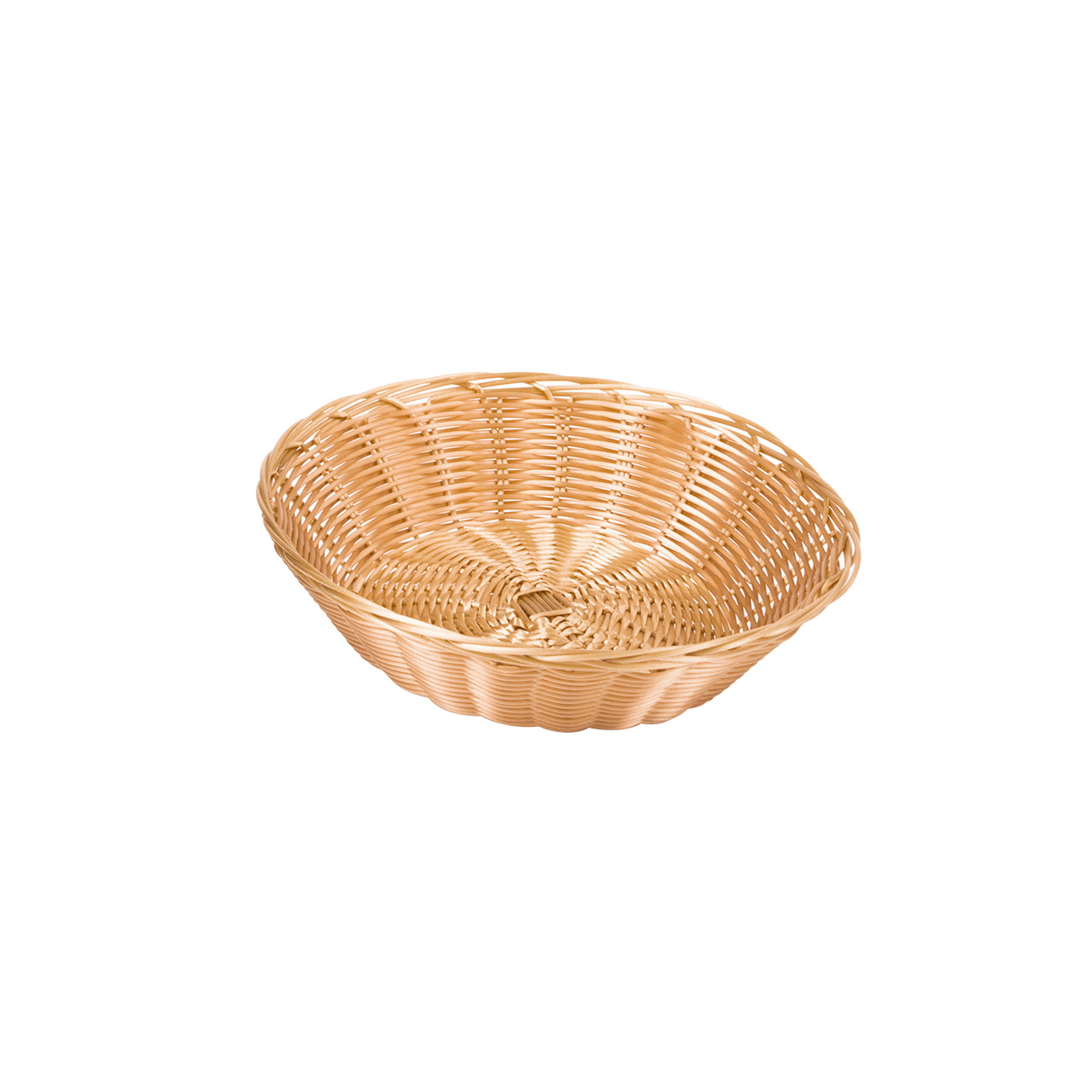 Polyratanový kulatý košík béžové barvy. Velmi snadná údržba, vhodný do myčky. Průměr 25 cm, výška 7 cm.