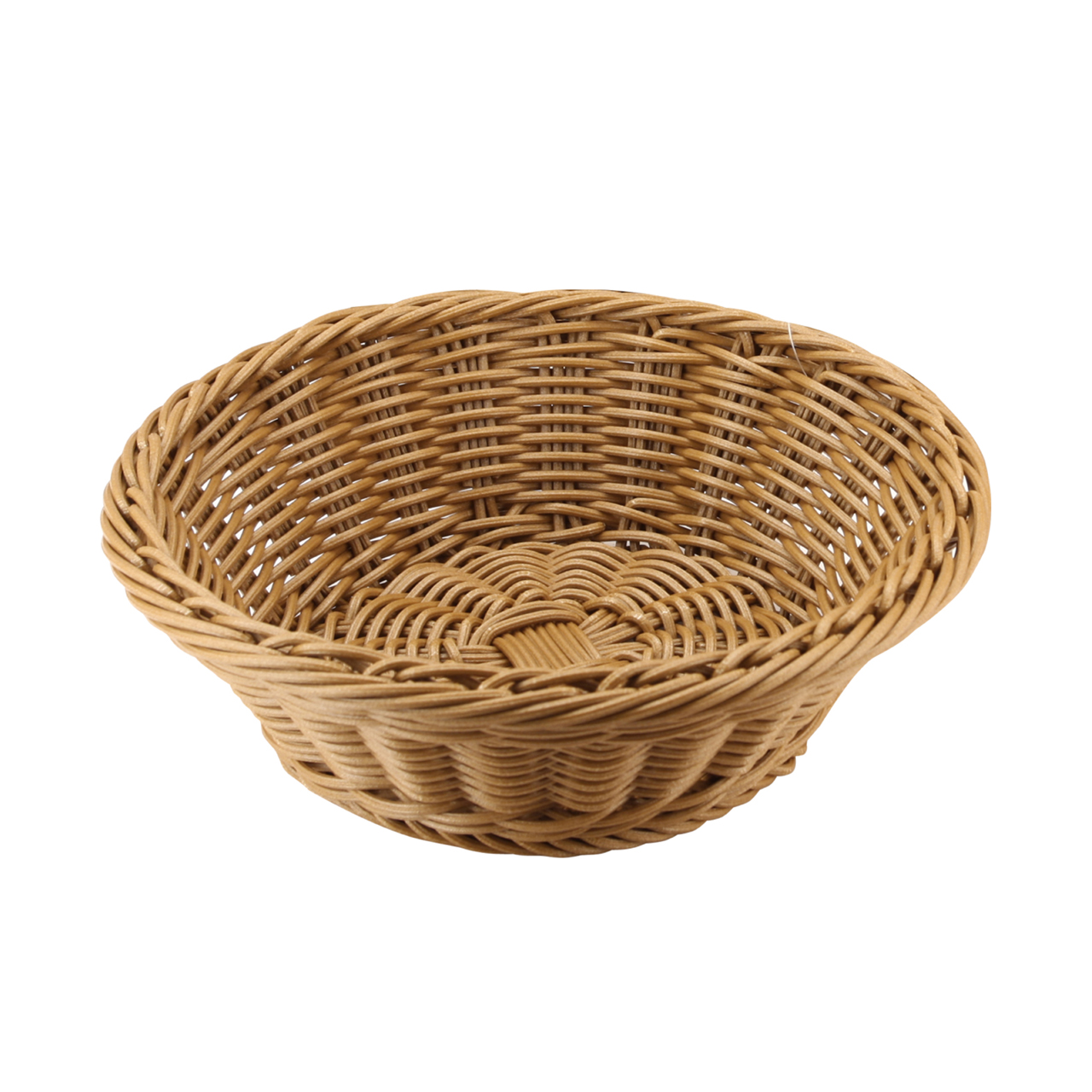 Kulatý košík z tmavého polypropylenového ratanu o průměru 18 cm a výšce 7,5 cm.