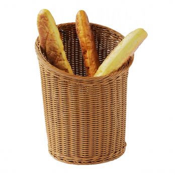 Košík na bagety z tmavého polypropylenového ratanu. Průměr dolní 26 cm / horní 32cm, šikmá horní část - výška 28 až 42 cm.