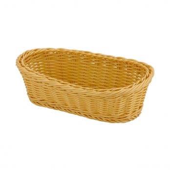 Oválný košík ze světlého polypropylenového ratanu o velikosti 28 x 15 x 7,5 cm, snadná údržba, lze mýt v myčce.