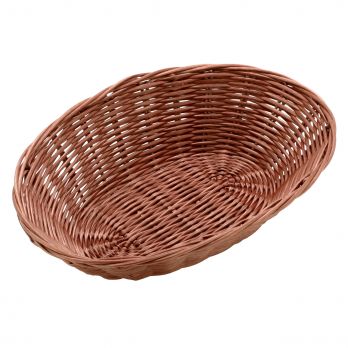 Lehký oválný košík z tmavého polypropylenového ratanu. Rozměr 23 x 15 x 6,5 cm. Vhodný pro pečivo, ovoce, příbory.