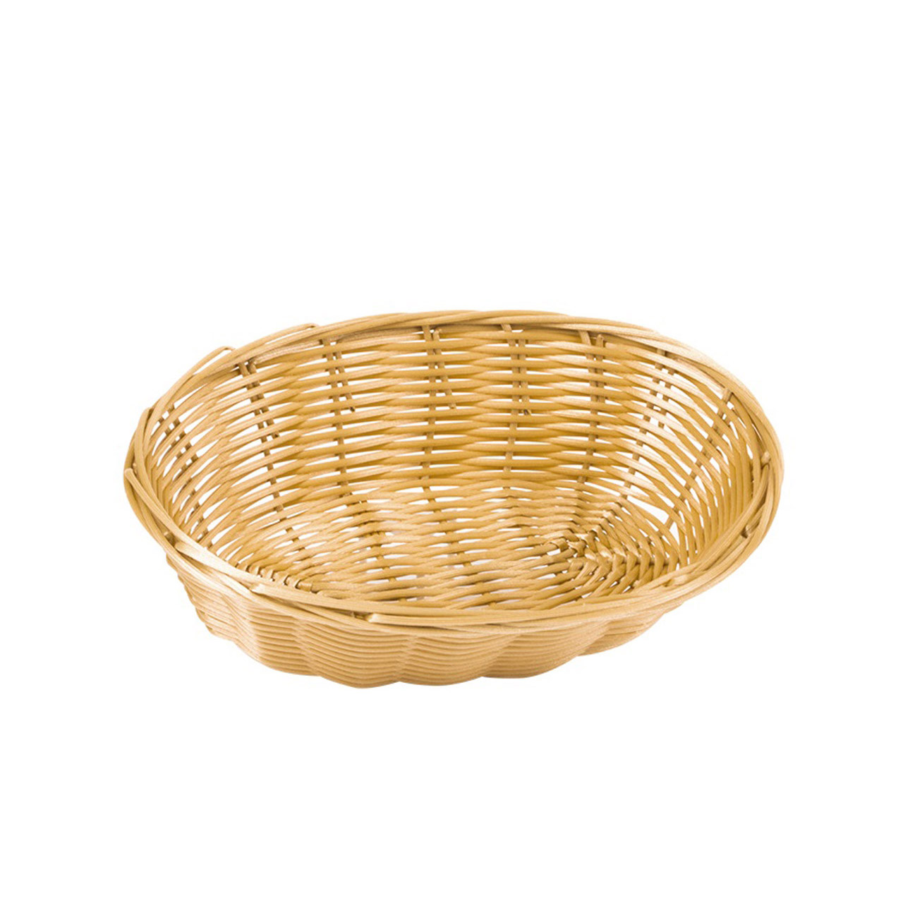 Polyratanový oválný košík béžové barvy. Velmi snadná údržba, vhodný do myčky. Rozměr 23 x 15 cm, výška 7 cm.