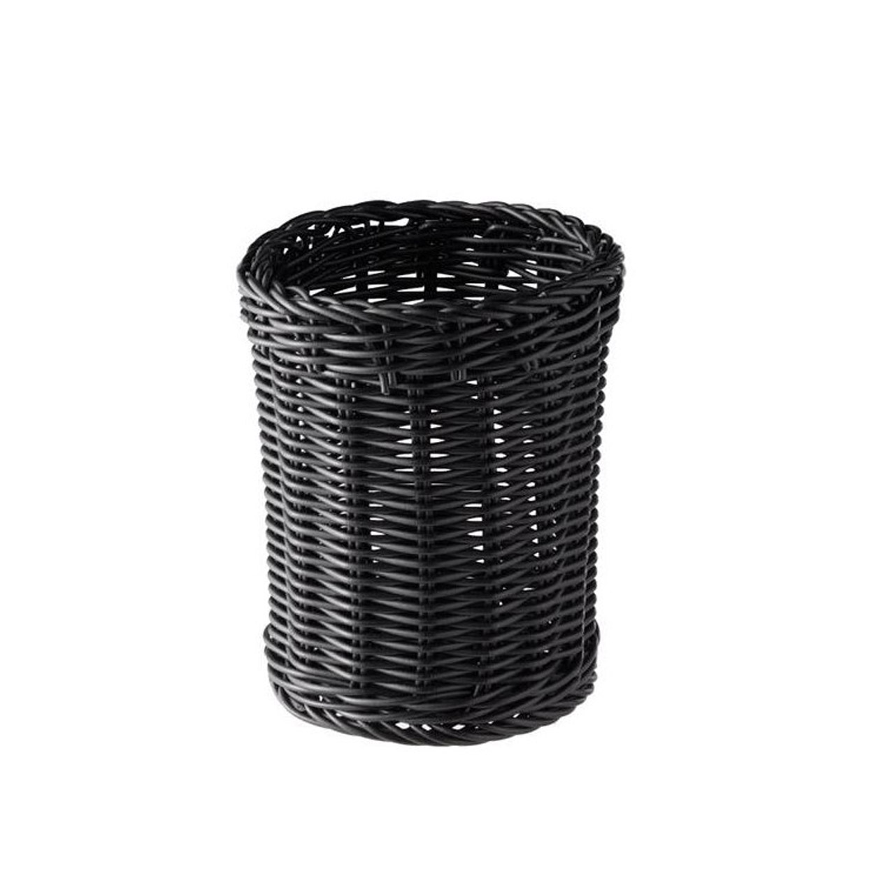 Kulatý košík / zásobník na příbory z polypropylenu imitujícího ratan. Nerozbitný produkt. Lze mýt v myčce na nádobí. Průměr 12 cm, výška 15 cm.