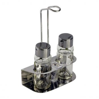 Stolní dochucovací souprava složená ze solničky a pepřenky, zásobníku na párátka. Materiál sklo, nerez.