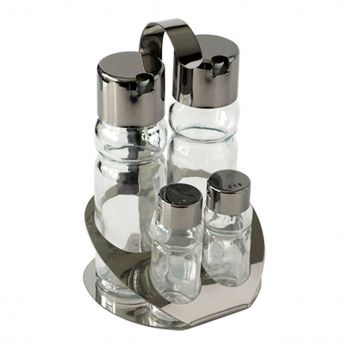 Stolní dochucovací souprava pro sůl, pepř, olej a ocet. Kombinace nerez / sklo. Rozměr 12,5 x 11 cm, výška 19 cm.