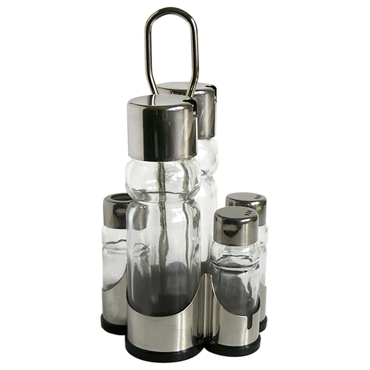 Stolní dochucovací souprava pro sůl, pepř, párátka, olej a ocet. Kombinace nerez / sklo. Rozměr 11,5 x 11 cm, výška 23 cm.