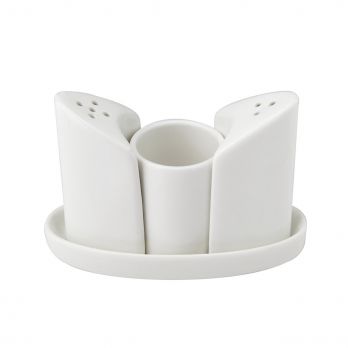 Porcelánový set menážek je složen ze 4 částí: 2 menážky na sůl a pepř, speciální stojánek na párátka a podstavec. Vyrobeno z bílého hotelového porcelánu. Menážky se dají kombinovat s různými sériemi hotelového porcelánu. Set lze mýt v myčce nádobí.