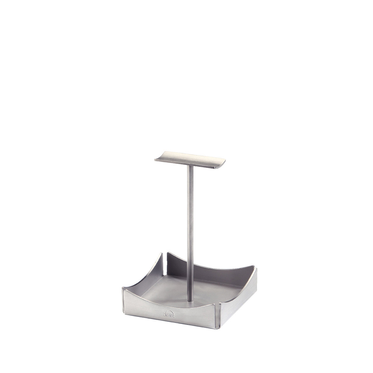 Nerezový stojan na dochucovací misky o rozměru 9,4 x 9,4 cm, výška 13 cm.