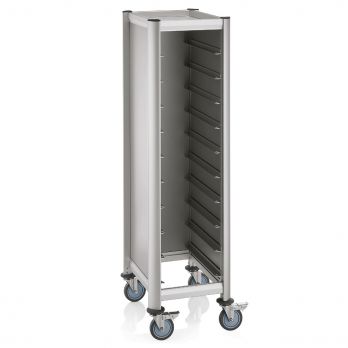 EN Regálový vozík SINGLE MENSA, pro 10 EN podnosů, stříbrná, 60 x 50 x 165 cm, MDF/hliník. Ideální pro profesionální použití v gastronomii. Vysoce kvalitní materiál zajišťuje dlouhou životnost a spolehlivost.