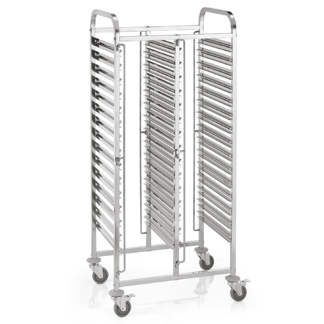 Regálový vozík CANTINA GN 1/1 pro 30 nádoba/60 podnosů, 55 x 74 x 171 cm, chromniklová nerezová ocel. Ideální pro profesionální použití v gastronomii. Vysoce kvalitní materiál zajišťuje dlouhou životnost a spolehlivost.