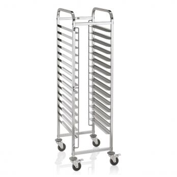Regálový vozík CANTINA pro 15 plechů 60 x 40 cm, 62 x 62 x 171 cm, chromniklová nerezová ocel. Ideální pro profesionální použití v gastronomii. Vysoce kvalitní materiál zajišťuje dlouhou životnost a spolehlivost.