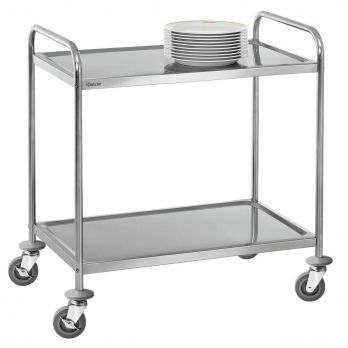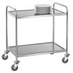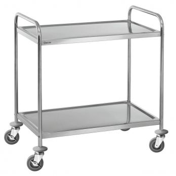 Servírovací vozík z chromniklové oceli s prolisovanými policemi. Se 4 otočnými kolečky průměru 100 mm, z toho 2 bržděná. Dodáváno v rozloženém stavu - SNADNÁ MONTÁŽ. Rozměry: 920 (Š) x 600 (H) x 945 (V) mm, rozměry polic: 830 (Š) x 510 (H) mm. Prostor mezi policemi 570 mm. Hmotnost: 10 kg.