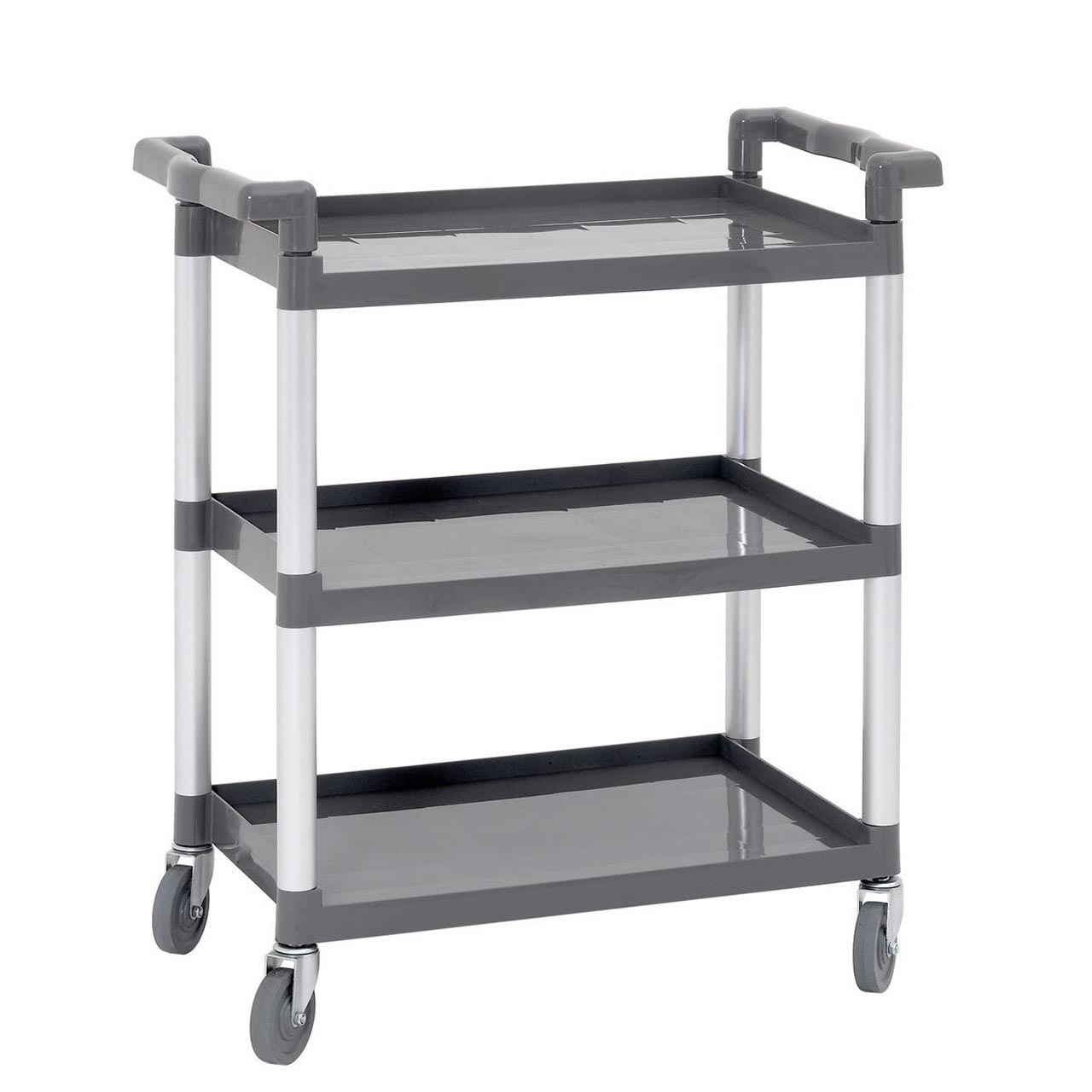 Servírovací vozík se 3 policemi, plast, nosné sloupky hliníkové, 4 otočná kolečka. Nosnost: 120 kg. Rozměry: 830 (Š) x 415 (H) x 940 (V) mm. Rozměry polic: cca 620 (Š) x 405 (H) mm. Vzdálenost mezi policemi 300 mm. (Stavebnice, snadná montáž). Hmotnost: 9,1 kg. Boční nádoby nejsou součástí dodávky. Můžete si doobjednat sadu 2 bočních nádob pro zavěšení na vozík - na příbory, na odpadky. Rozměr odpadkového koše: Š 335 x H 237 x V 560 mm / objem 30 litrů. Rozměr košíku na příbory: Š 333 x H 230 x V 178 mm / objem 9 litrů.