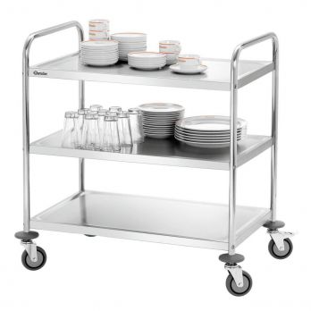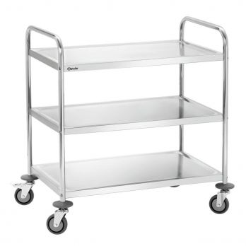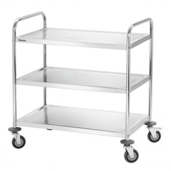 Servírovací vozík Bartscher se 3 policemi je ideální pomocník pro kuchyně a restaurace. Materiál chromniklová nerezová ocel. Vybaven 4 kolečky (průměr 10 cm), z toho 2 brzděná. Kolečka jsou vyhotovena z odolné a pevné gumy. Dodáváno v rozloženém stavu - jednoduchá montáž. - 3 police - rozměry polic: 827 x 510 mm; mezi policemi 265 mm - nosnost na polici 30 kg - rám z kulaté trubky, pr. 25,8 mm - 4 nárazníky, plast - rozměr: Š 920 x H 600 x V 945 mm - hmotnost 13,4 kg