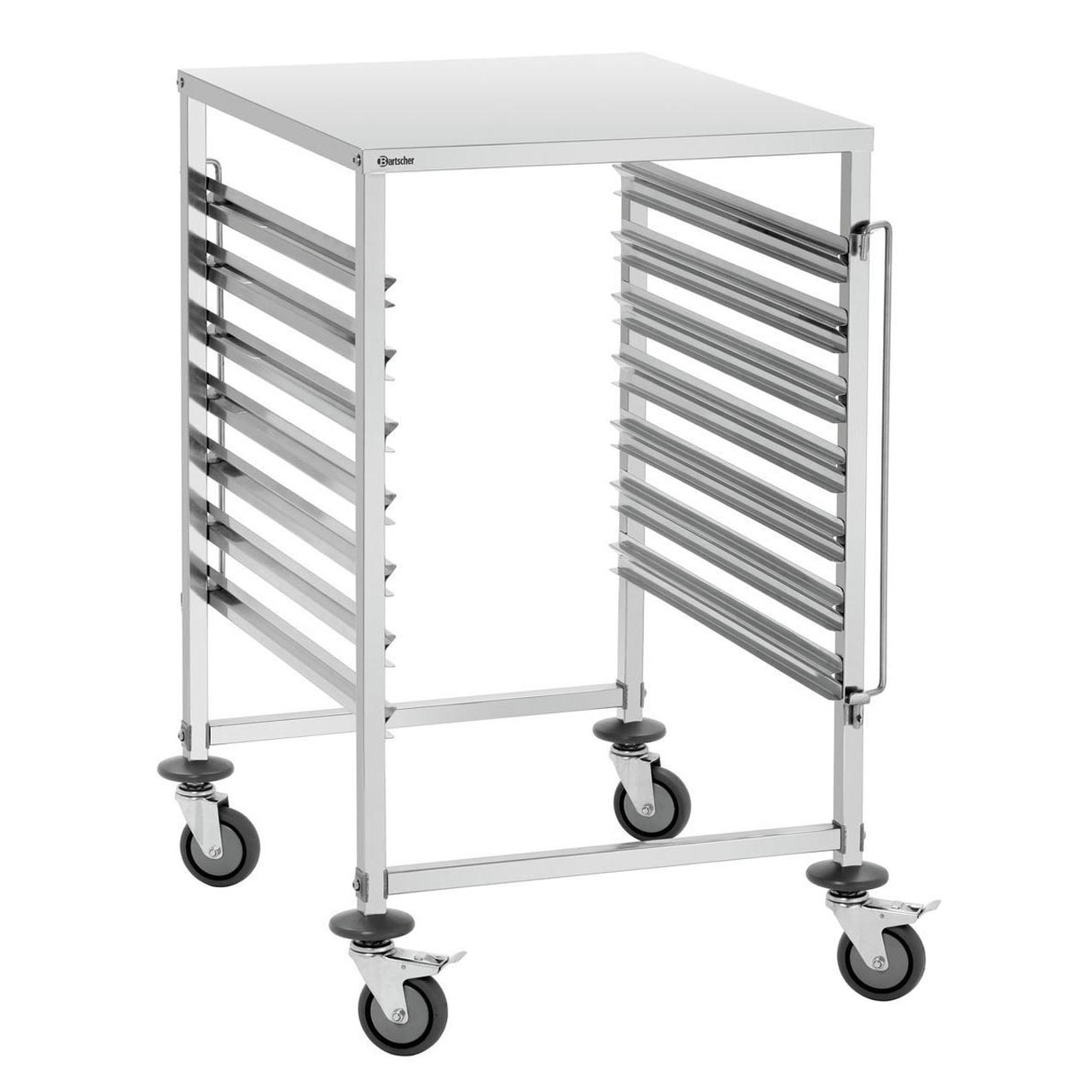 Transportní vozík Bartscher se 7 vsuvy oboustranně zasouvací pro gastronádoby hloubky max. 65 mm velikosti GN 1/1 a GN 2/1, plechy a rošty. Nejsou součástí dodávky. S odkládací plochou o nosnosti max. 18 kg. Vozík je vyroben z nerezu, jednoduchá montáž. Rámy jsou z čtvercových trubek o rozměrech 25,8 x 25,8 mm. Vzdálenost (rozteč) mezi jednotlivými vsuvy je 80 mm. Maximální nosnost celého vozíku je 90 kg, nosnost jednotlivého vsuvu je 12 kg. 4 gumová otočná kola o průměru 100 mm, 2 bržděná. Plocha stání 590 x 670 mm. Rozměry: 655 x 740 x 1010 mm (Š x H x V) Hmotnost: 15,8 kg