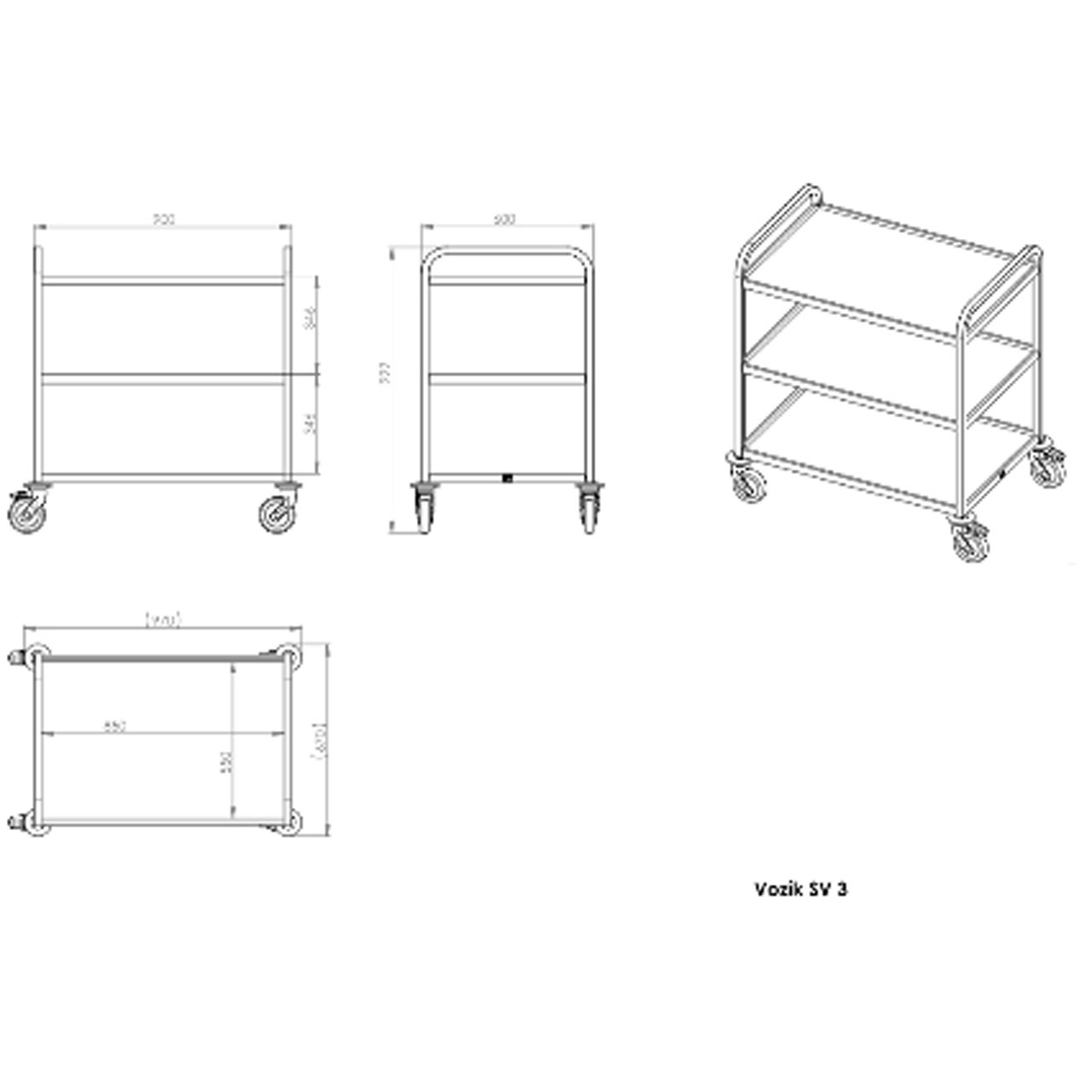 Servírovací vozík z chromniklové oceli 18/10. Konstrukce je z nerezových profilů a broušeného plechu. Kolečka: průměr 125 mm. 4 otočná kolečka, z toho 2 s brzdou. Police: 3 ks. Rozměry: 970x670x1000 mm. Rozměry pracovní plošiny: 845x545 mm. Nosnost vozíku: 120 kg. Nosnost police: 40 kg. Hmotnost: 24 kg. Rozteč polic 315 mm.