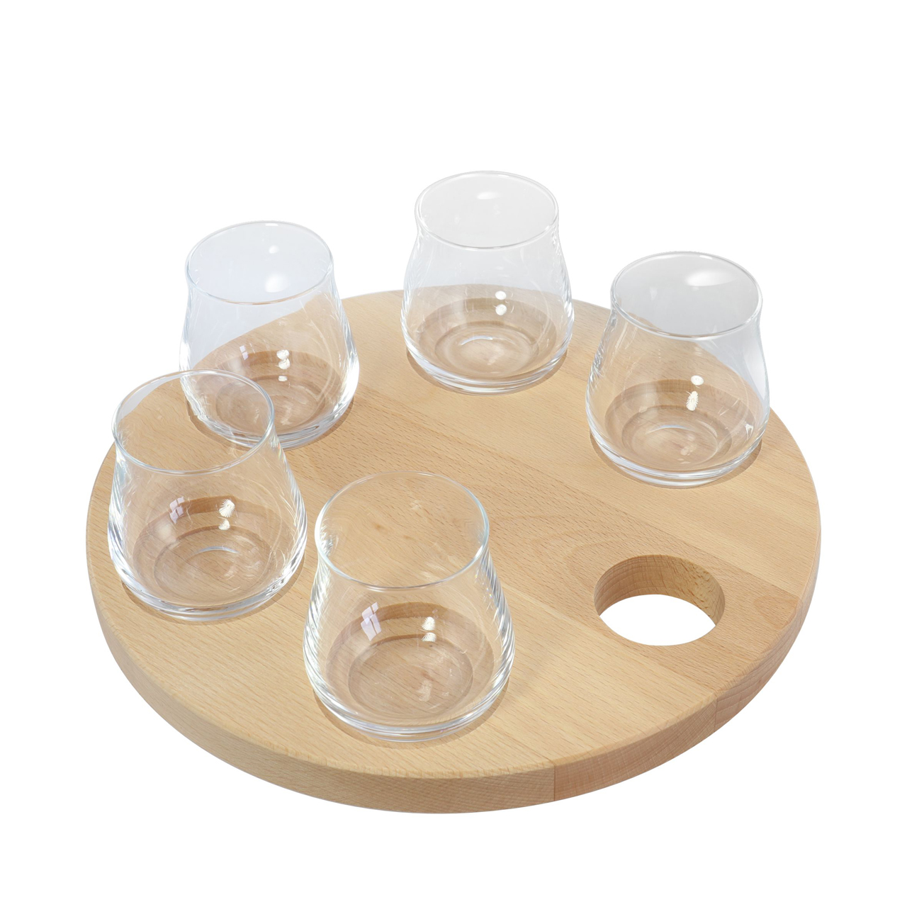 Dřevěné prkénko kulaté o průměru 25 cm bez loga pro degustaci piv, pro 5 sklenic 0,1 l.
