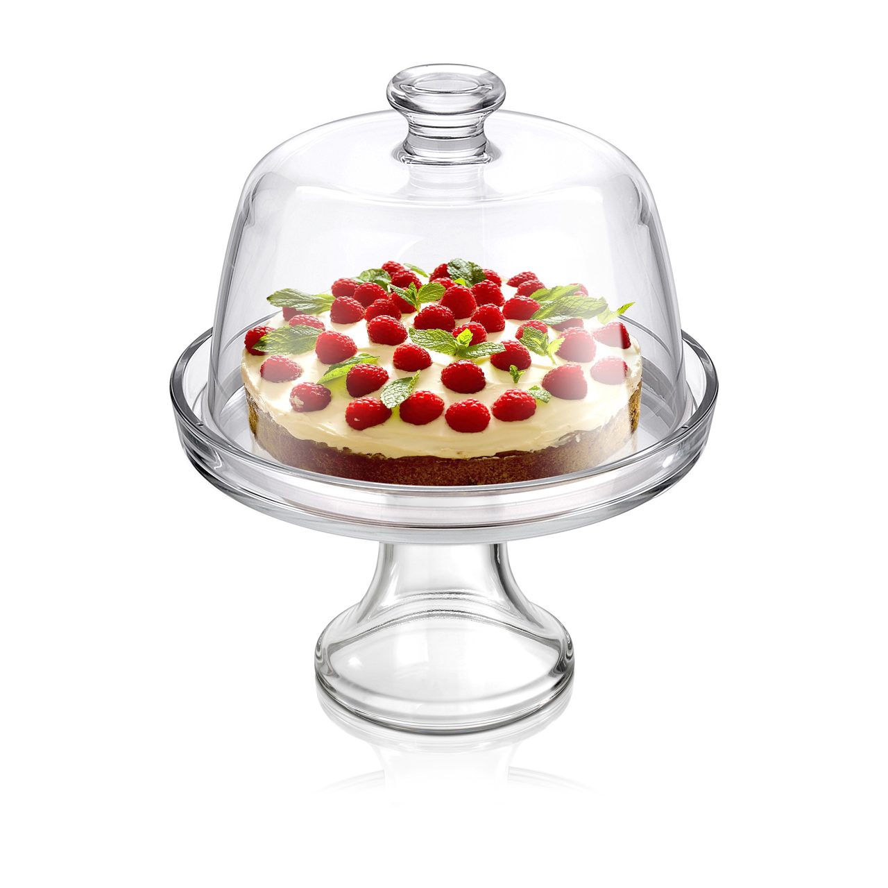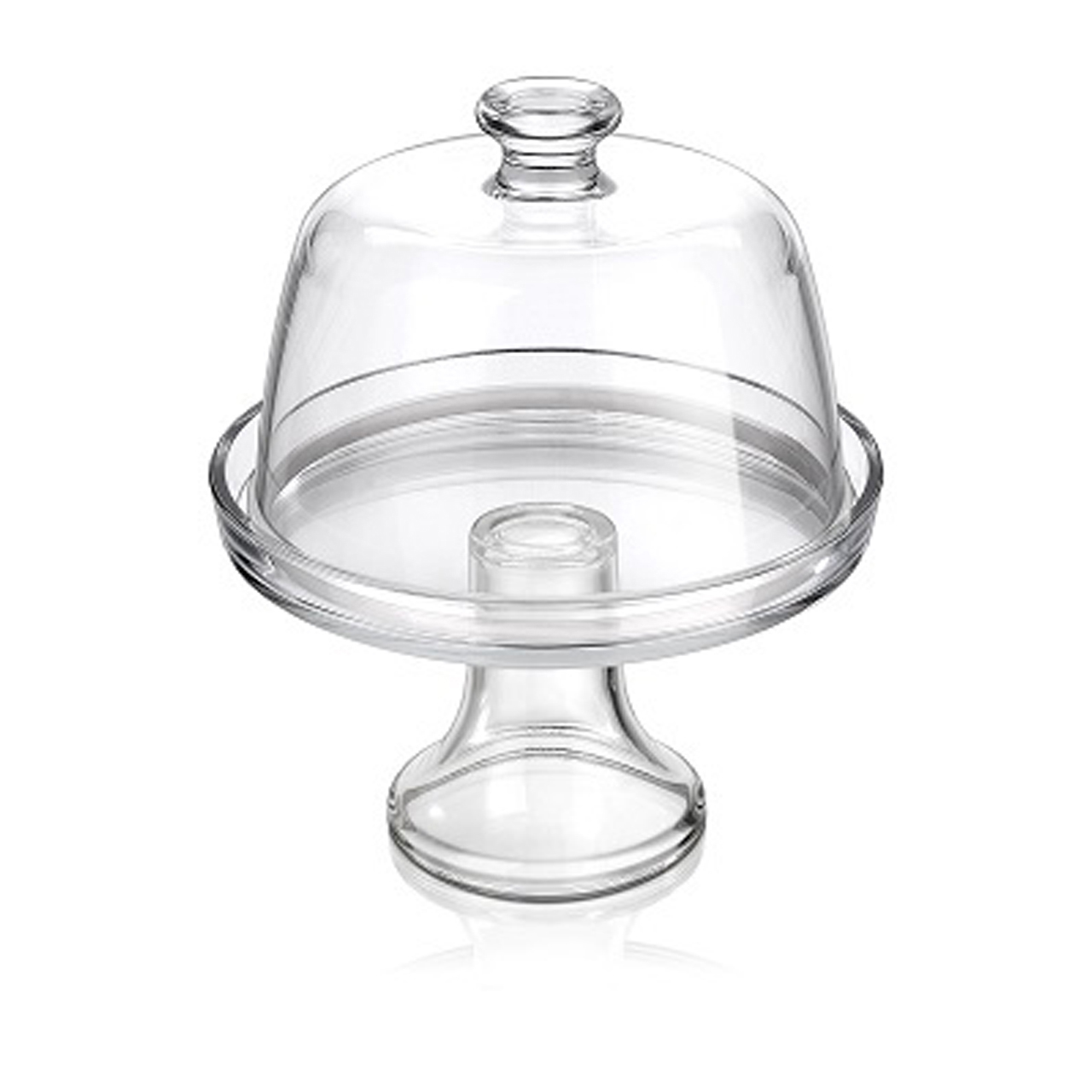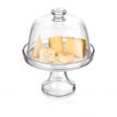 Skleněný podnos na noze s poklopem na dorty, zákusky a sýry. Výška poklopu 11 cm, vnitřní průměr 20 cm.