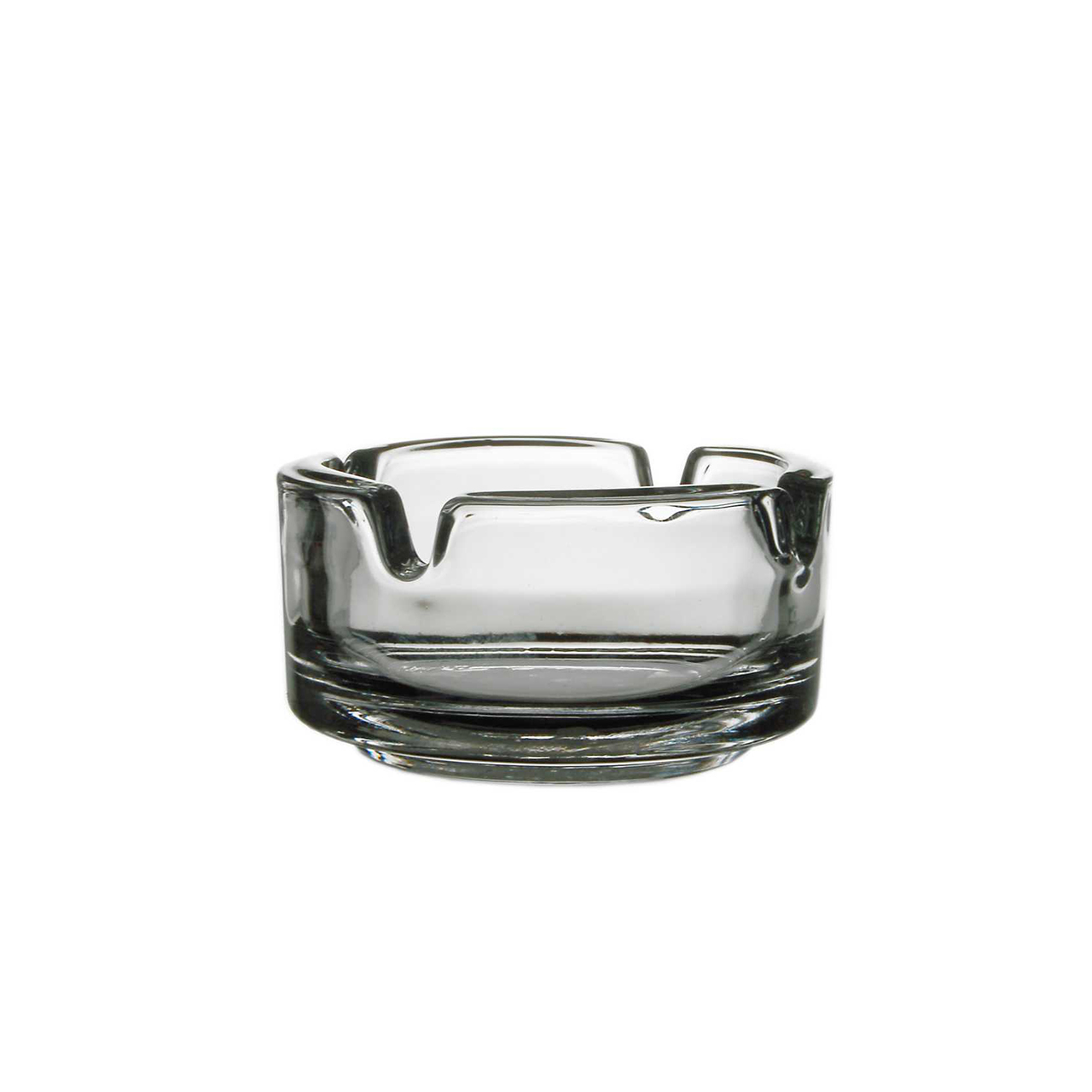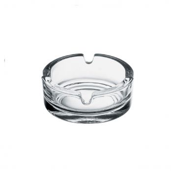 Skleněný popelník čirý o průměru 7,2 cm.