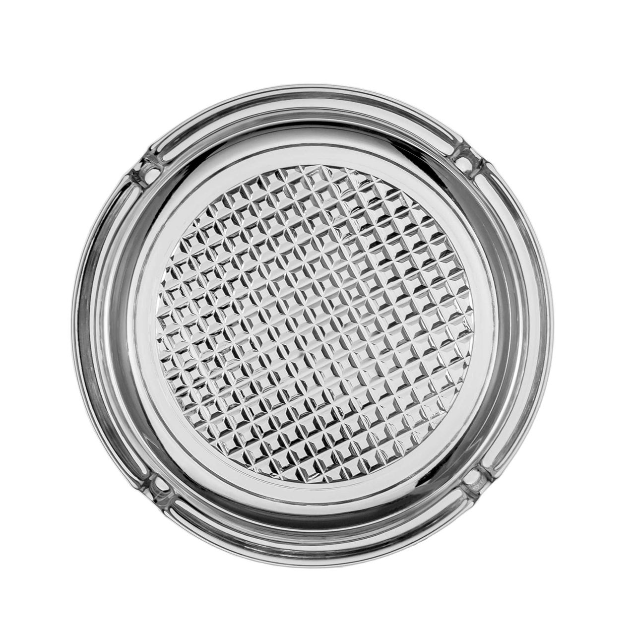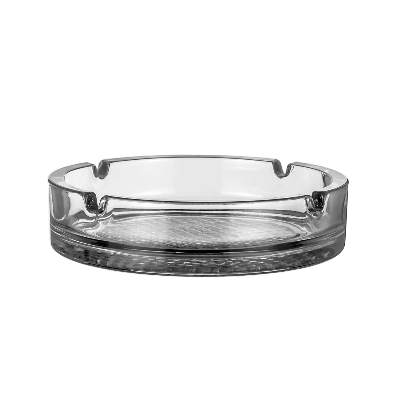 Skleněný popelník čirý o průměru 14 cm.