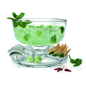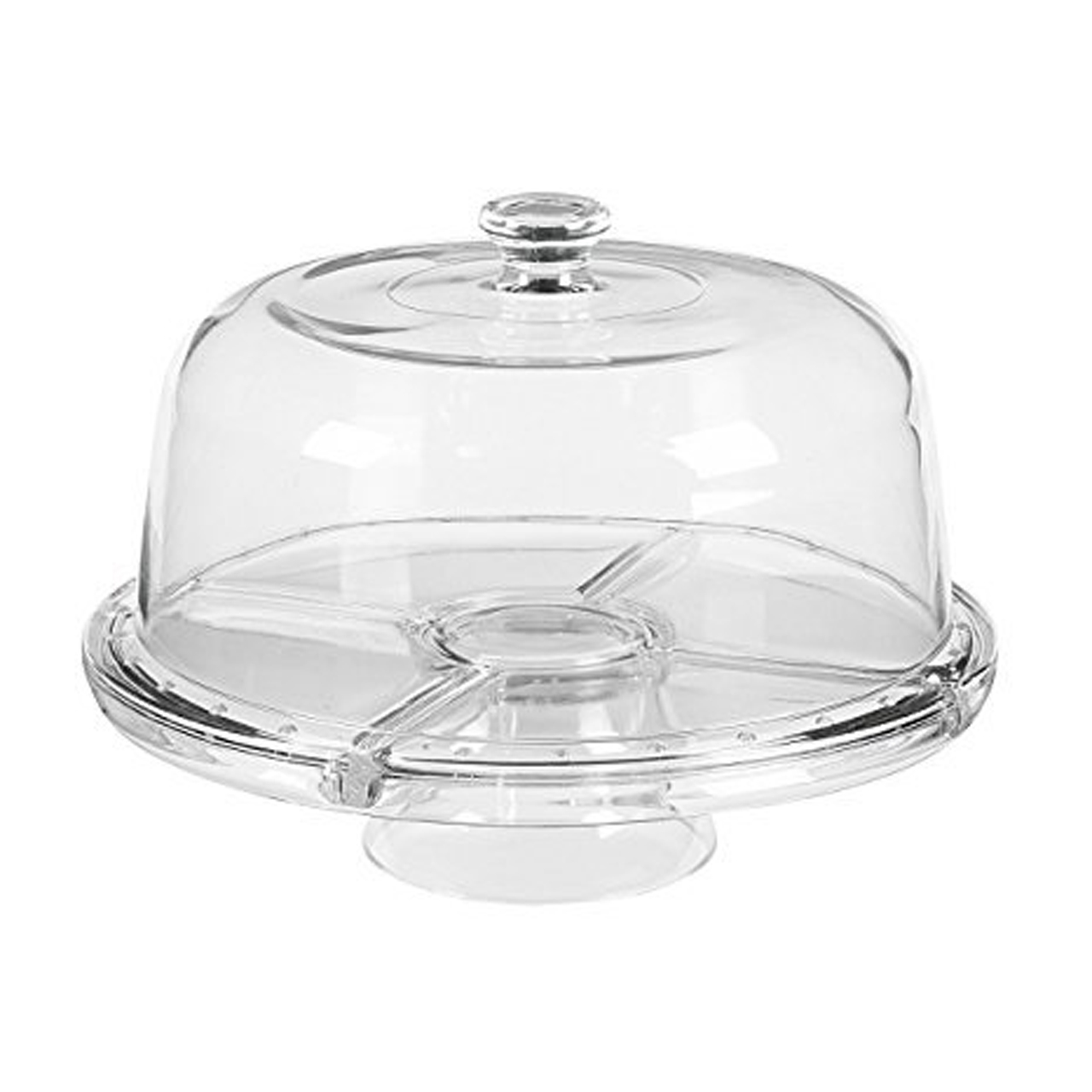 Skleněný talíř / podnos rozdělený na 4 části a misku. Použitelný oboustranně. Výška poklopu 12 cm, vnitřní průměr 26 cm.