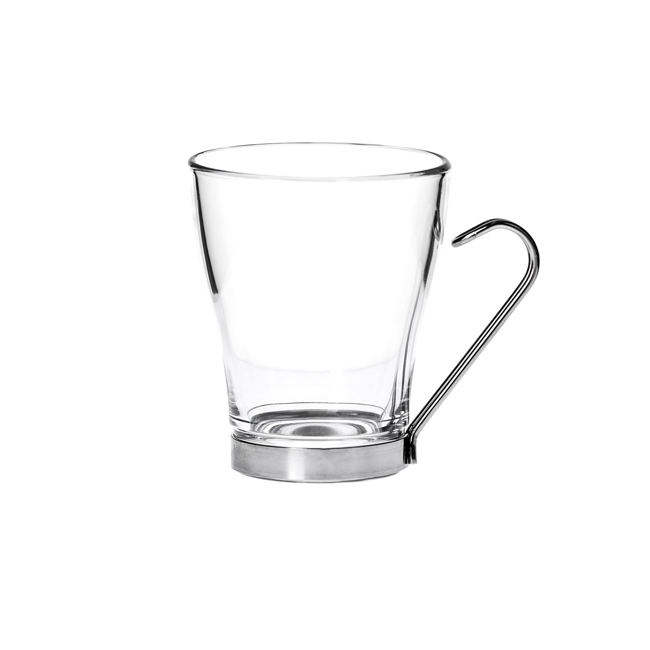 Skleněný hrnek s kovovým uchem a okružím na dně sklenice o objemu 0,24 l.