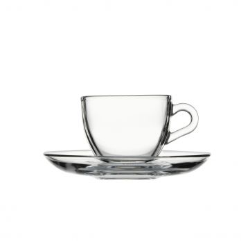 Skleněný šálek o objemu 0,09 l s podšálkem vhodný na horké nápoje.