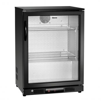 Barová vitrína na lahve s kapacitou 124 l. Vnitřní osvětlení, LED, dvojité prosklené dveře samouzavírací. Digitální displej. Materiál nerezová ocel, uvnitř hliník. Uzamykatelná. - objem 124 l, jednodveřová, bezpečnostní zarámované dvojité sklo - 2 pochromované rošty, výškově nastavitelné, rozměr Š 835 x H 350 mm - statické chlazení s dodatečným ventilátorem - teplotní rozpětí od 1 do 10 °C, elektronická regulace teploty, v krocích po 1 °C - termostat, izolace Cyclopentan, 45 mm pro stranu - chlazení R600a, do okolní teploty 30 °C - kondenzace odpařování vody, automatické odtávání - pravý pant skleněných dveří, neměnný - kontrolka rozmrazování, provozu, ZAP/VYP, kompresoru, teploty