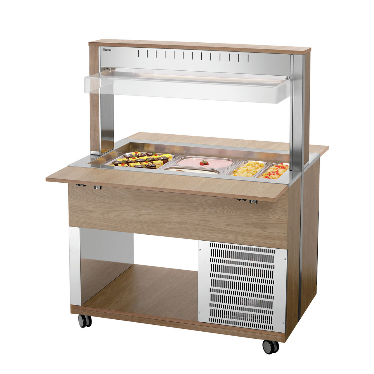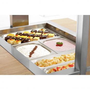 Bufetový chladicí vozík pro 3x GN 1/1-200 mm (530 x 325 mm) s hygienickou ochranou a LED osvětlením (lze spínat samostatně). 5x otočná kolečka, 2 z toho uzamykatelná. Dodává se smontovaný. Součástí 3 příčky: D 528, Š 30 mm. Materiál laminované dřevo, nerez, plast. Barva jilmu. Parametry: - 1 nerezová vana, výpustný kohout - pro 3x GN 1/1 (530x325 mm), max. do 200 mm (gastronádoby nejsou součástí dodávky) - teplotní rozsah 2 až 4 °C - sklápěcí police na tácy, rozměr: Š 1170 x H 250 mm - LED osvětlení, lze spínat samostatně - hygienická ochrana proti vnějším vlivům - kontrolka ZAP / VYP - spirálový propojovací kabel, délka 1,8 m - 5x otočná kolečka, 2 z toho uzamykatelná. Příkon: 0,34 kW / 230 V / 50 Hz Rozměr: Š 1170 x H 1245 x V 1510 mm Hmotnost: 137 kg
