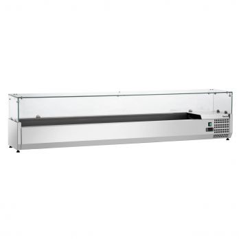 Z nerezové potravinářské oceli se skleněným nástavcem pro 10x1/4 GN, o hloubce 150 mm. Elektronické ovládání, odpařování zkondenzované vody, digitální teploměr. Statické chlazení, chladivo R290. Provozní teplota: 0 °C až 10 °C. Skleněný nástavec: Š 1990 x H 330 x V 195 mm, bezpečnostní sklo. Chladicí jednotka s chladicím žlabem. S uchycením na sklo. Příslušenství zahrnuje: 4 příčky: 181 x 25 mm, 9 příček: 264 x 25 mm. GN objednávejte samostatně. Příkon: 0,194 kW/230 V. Rozměry: Š 2000 x H 335 x V 459 mm. Hmotnost: 51,0 kg.
