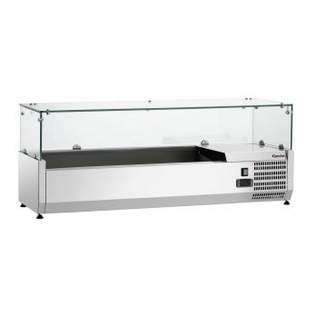 Z nerezové potravinářské oceli CNS se skleněným nástavcem pro 3x1/3 GN + 1/2 GN, o hloubce 150 mm. Elektronické ovládání, odpařování zkondenzované vody, automatické odtávání, digitální teploměr. Statické chlazení, chladivo R290. Provozní teplota: 0 °C až 10 °C. Chladicí jednotka s chladicím žlabem. S uchycením na sklo. Skleněný nástavec: 1190 x 390 x 195 mm, bezpečnostní sklo. Příkon: 0,166 kW/230 V. Rozměry: Š 1200 x H 395 x V 459 mm. Hmotnost: 39 kg. Příslušenství zahrnuje: 4 příčky: 181 x 25 mm, 4 příčky: 326 x 25 mm a 1 příčku: 326 x 45 mm. Gastronádoby objednávejte samostatně.