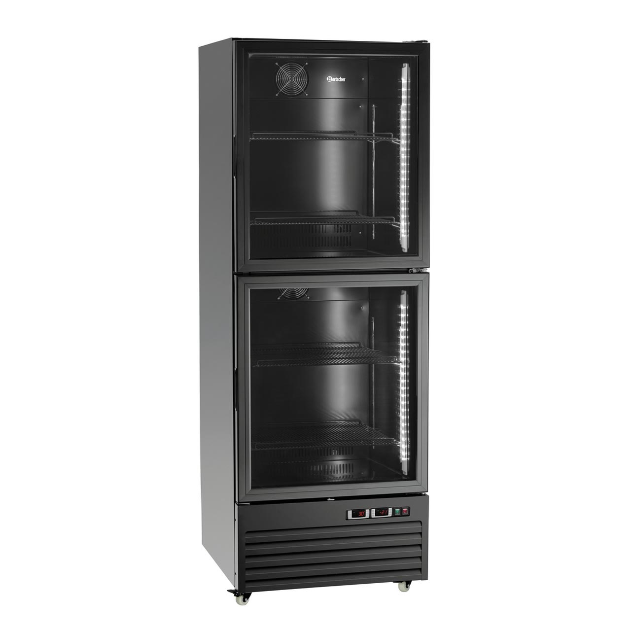 Kombinace chladničky a mrazničky v černém provedení. Užitná kapacita 430 litrů. Prosklená dvířka, samostatně zapínatelné LED osvětlení. Rámované přední okno, dvojité zasklení. Materiál lakovaná ocel, vnitřní černý plast. Chlazení nahoře, mražení dole. 4 otočná kolečka, 2 uzamykatelná. LED osvětlení lze samostatně spínat. Topné zařízení, aby se zabránilo kondenzaci. - 4 roštové police, lakované, výškově nastavitelné, rozměr: Š 565 x H 475 mm - vzdálenosti mezi drážkami 15 mm - chladicí kompresor, cirkulující vzduch, automatické odmrazování, kondenzační odpařování - teplotní rozsah 0°C až 10°C / -18 °C až -22 °C - regulace teploty v krocích po 1°C, termostat - chladicí kapalina R290 / 0,100 kg - 2 křídlové dveře, panty vpravo (nelze změnit), sklo - digitální displej, vnitřní osvětlení, elektronické ovládání Příkon: 0,767 kW / 230 V / 50 Hz. Rozměr: Š 700 x H 780 x V 2000 mm. Hmotnost 121,4 kg.