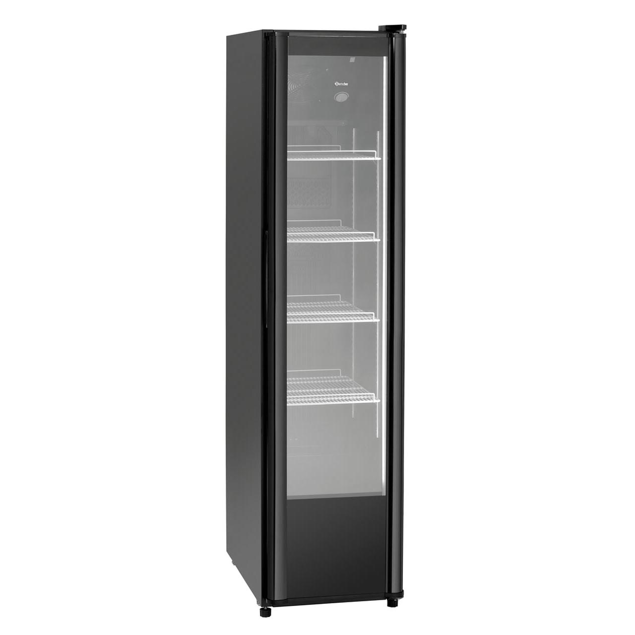 Úzká vitrína, prosklené samouzavírací dveře, bezpečnostní dvojité sklo zarámované. Pravý pant, neměnný. Rozměr polic Š 355 x H 450 mm, materiál nerez potaženo plastem, 4 police, nastavitelné. Uvnitř práškově lakovaná ocel, barva černá. Objem 300 litrů. Chlazení cirkulujícím vzduchem. Teplotní rozsah od 2 do 8 °C. Mechanická plynulá regulace teploty, termostat. Chladicí kapalina R600a. Do okolní teploty + 30 °C. Odpařování kondenzátu. Vlastnosti: 1 ventilátor, LED osvětlení samostatně regulovatelné, 4 kolečka, 2 nožičky (nejsou výškově nastavitelné. Příkon: 0,3 kW / 230 V. Materiál: práškově lakovaná ocel, sklo, plast ABS. Rozměr: Š 440 x H 705 x V 1865 mm. Hmotnost: 78 kg.