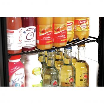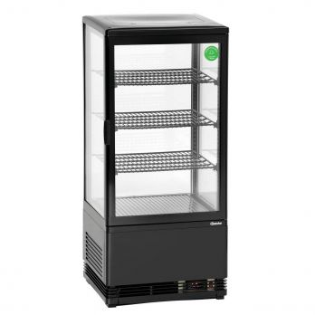 Chladicí minivitrína s osvětlením. Chlazení oběhem vzduchu, automatické odmrazování. Příslušenství zahrnuje 3 výškově nastavitelné rošty, rozměr: 380 x 325 mm. - objem: 78 litrů - provozní teplota: od 2 do 6 °C (nastaveno od výrobce) - rozměr: Š 435 x H 385 X V 960 mm - příkon: 0,18 kW / 230 V - hmotnost: 33,2 kg