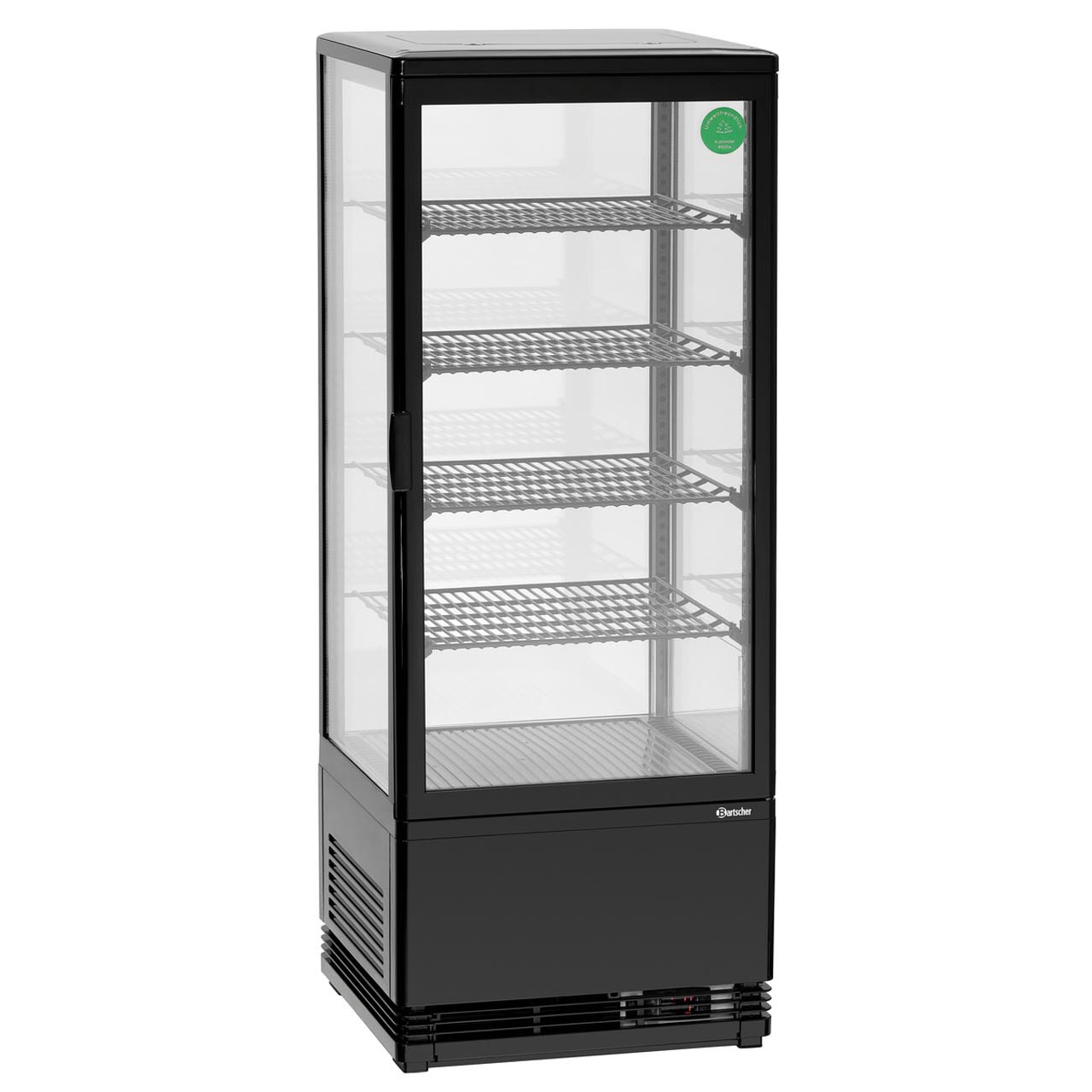 Chladící minivitrína s osvětlením. Chlazení oběhem vzduchu, automatické odmrazování. Objem: 98 litrů. Provozní teplota: od 2 do 6 °C (nastaveno od výrobce). Zapnutí/vypnutí. Příkon: 0,18 kW/230 V. Rozměry: 435 (Š) x 385 (H) x 1105 (V) mm. Hmotnost: 38,4 kg. Příslušenství zahrnuje: 4 výškově nastavitelné rošty.